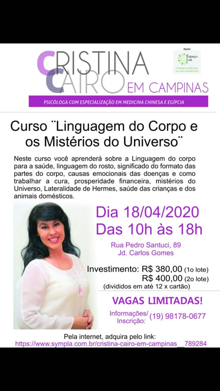 Com temas ligados à qualidade de vida e saúde, Cristina Cairo estará na cidade de Campinas, no próximo dia 18 de Abril. O curso "Linguagem do Corpo e os Mistérios do Universo" serão os temas principais abordados no encontro. A convidada é psicóloga com especialização em Medicina Chinesa e Egípcia. Trata-se da sua primeira apresentação aberta ao público em Campinas. Cristina Cairo já esteve na cidade outras vezes, mas como palestrante convidada e contratada para eventos corporativos e fechados.